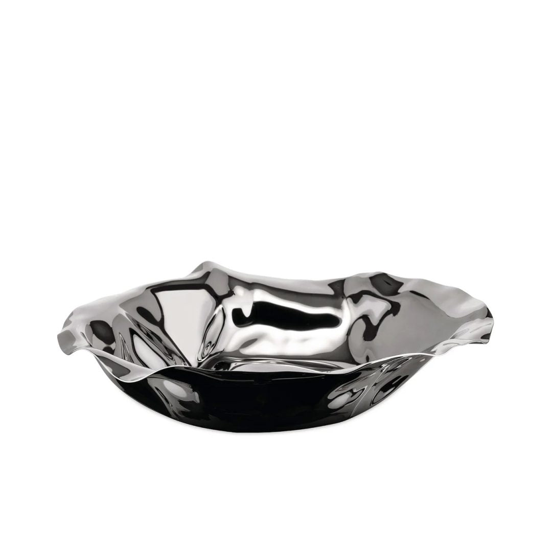 Denna skål från Alessi, kallad Sarrià Round Basket, är tillverkad av rostfritt stål och har en minimalistisk och modern design. Den är designad av Lluís Clotet, som har hämtat inspiration från ett ihopskrynklat papper.