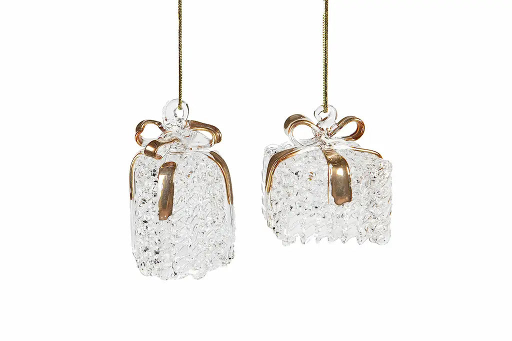 Klä julgranen eller dekorera blomsterarrangemanget med hängande dekorationer som ser ut som julklappar. Tillverkade av glas.