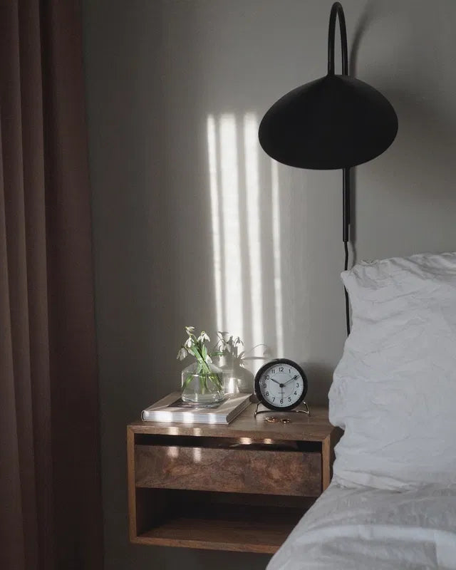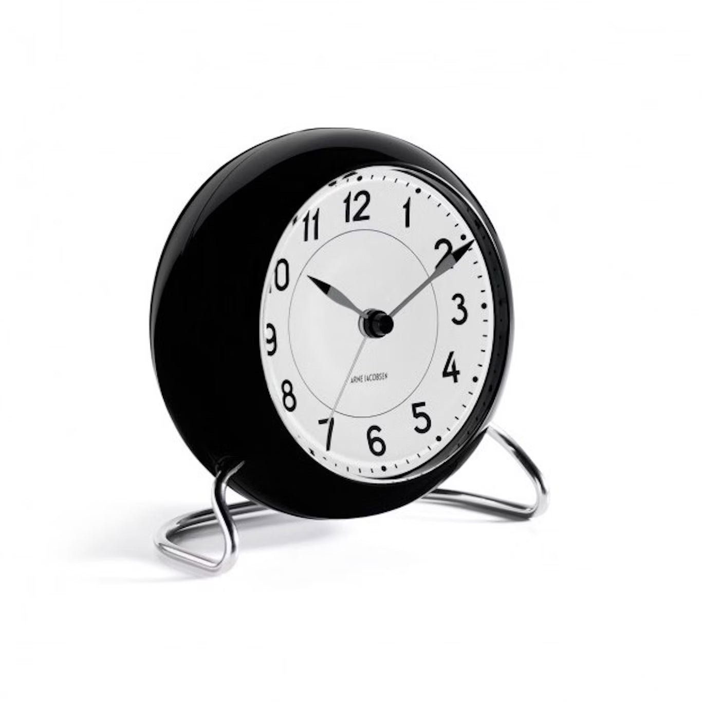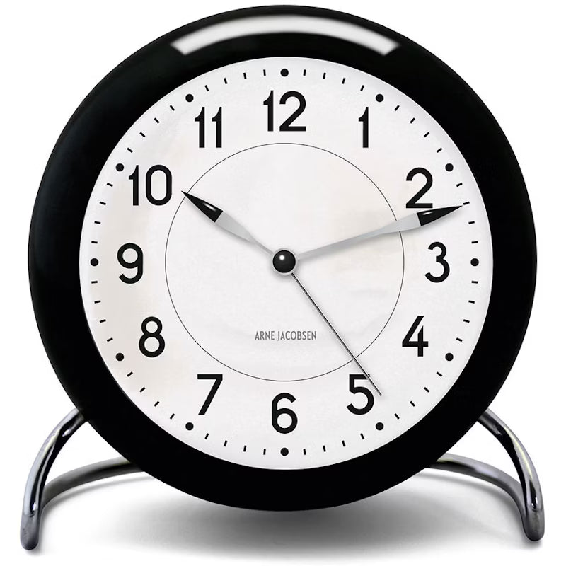 Väckarklocka från Arne Jacobsen. Väckarklockan har en klassisk formgivning med tydliga siffror och en stabil fot i aluminium och ett alarm med en snooze-funktion och en inbyggd LED.