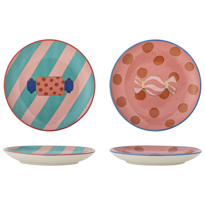 Caramella-tallriken från Bloomingville tillför en färgstark och lekfull känsla till dukningen. Tallriken med handmålade mönster inspirerade av godismotiv. Den praktiska storleken gör dem perfekta för att servera lunch eller dessert, och de handmålade detaljerna gör varje tallrik helt unik.