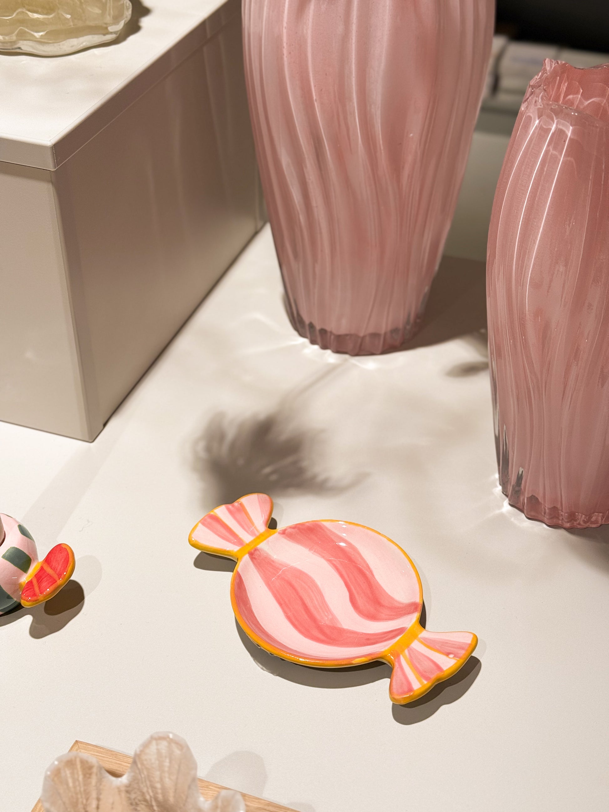Caramella serveringsfat från Bloomingville är tillverkat av stengods och handmålat i mjuka, harmoniska nyanser. Det lilla fatet har en form inspirerad av karameller och passar utmärkt för att servera godis, snacks eller andra små tilltugg. En lekfull och färgstark detalj som livar upp dukningen – varje exemplar är unikt i sitt uttryck.