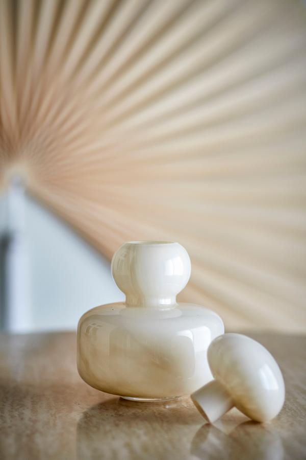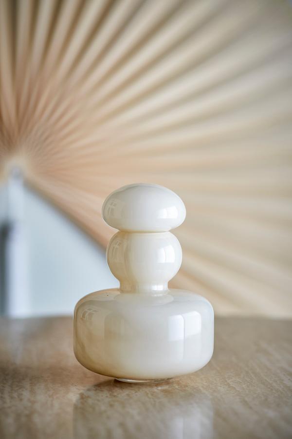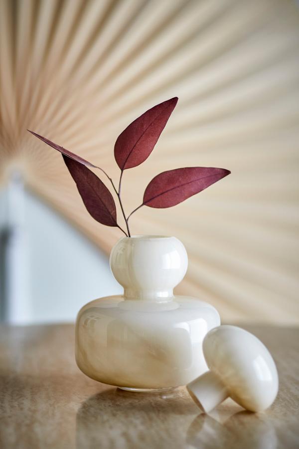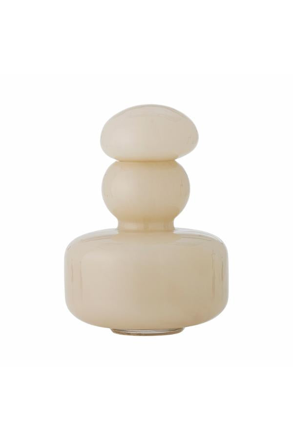 En dekorativ glasvas i en blank beige ton med en mjuk, lager-på-lager-silhuett. Vasen har ett avtagbart lock som enkelt kan tas av när man placerar en blomma och sätta tillbaka när det används enbart som dekoration. Locket kan användas som en detalj eller som en liten vas!