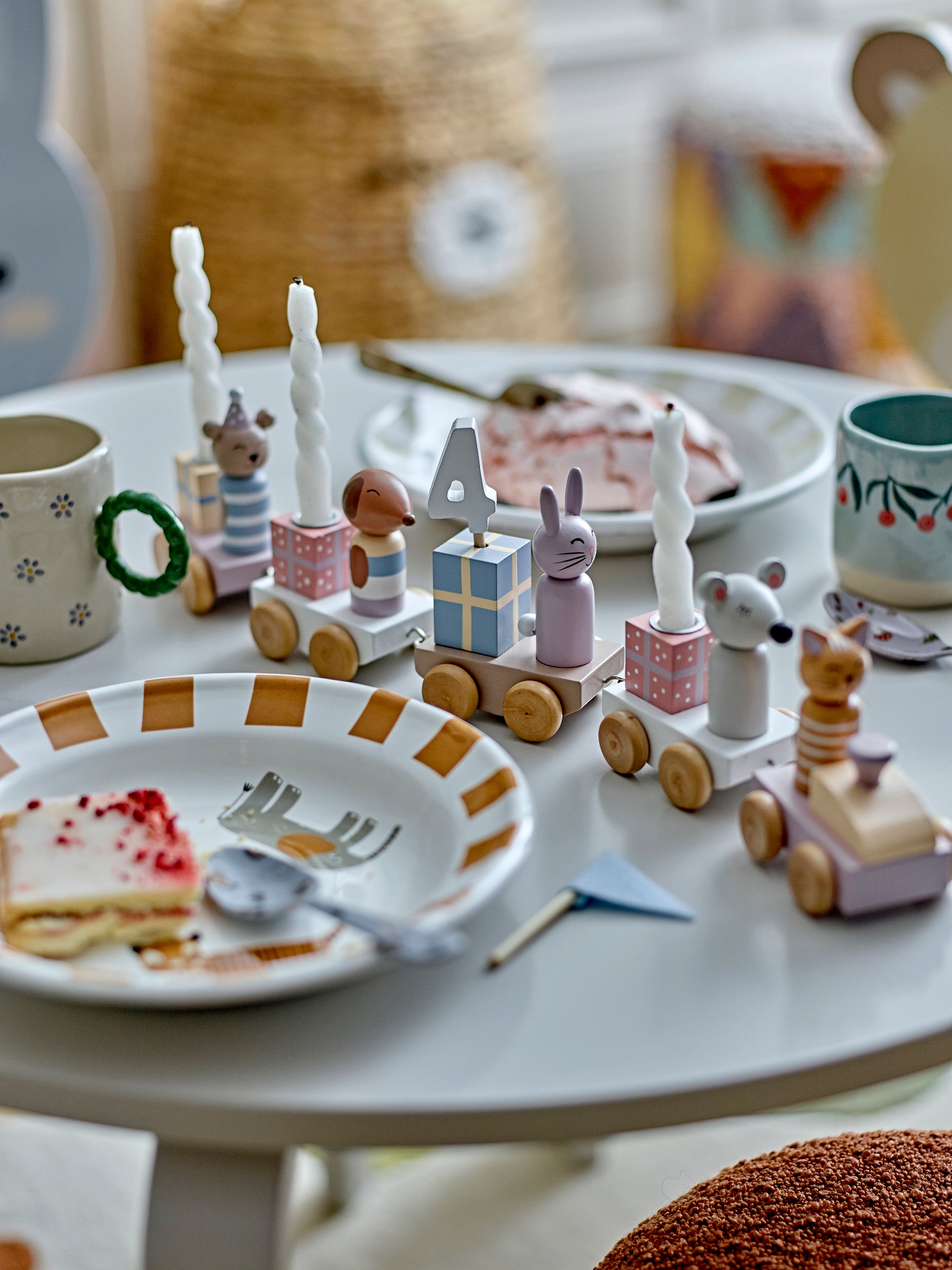 Junaid Födelsedagståg från Bloomingville gör födelsedagsfirandet extra speciellt. Det festliga födelsedagståget består av fem vagnar med söta presenter och djur i vackra färger. Det charmiga tåget levereras med siffror från 0–9, har plats för tre ljus och kan användas som dekoration i barnrummet året runt. Tåget är tillverkat av FSC-certifierat trä. Den perfekta gåvan till babyshower eller dop.
