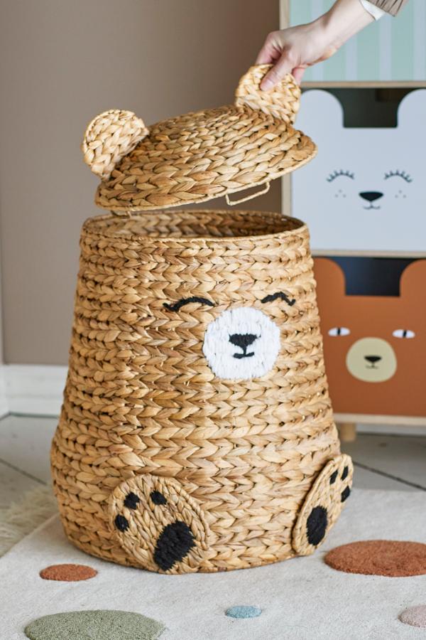 Timone korg med lock från Bloomingville är idealisk för förvaring samtidigt som den är en rolig lekkamrat. Den stora björnkorgen håller koll på alla leksaker och ger en mysig känsla till varje rum. Korgens lock kan tas bort, vilket gör det lätt för små händer att komma åt nallar och leksaker och lägga undan dem igen.