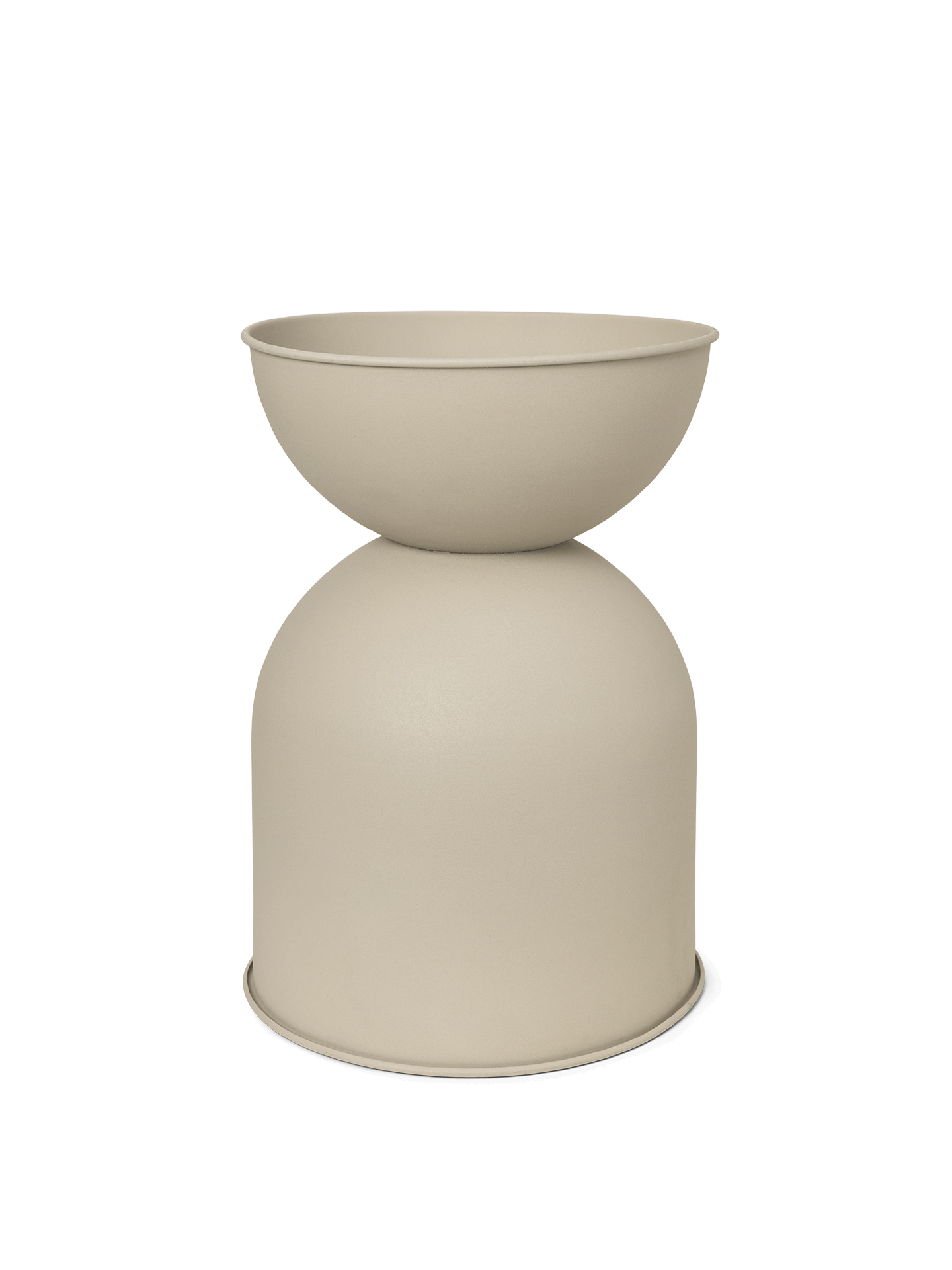 Ferm Living Hourglass Pot - Medium i färgen Cashmere är en elegant kruka tillverkad av pulverlackerad metall med en matt finish. Den har en unik timglasform som gör den till ett iögonfallande inslag i vilket rum som helst. Krukan är designad för att lyfta upp växter från golvet och kan användas både inomhus och utomhus, eftersom den är tillverkad för att tåla väder och vind.