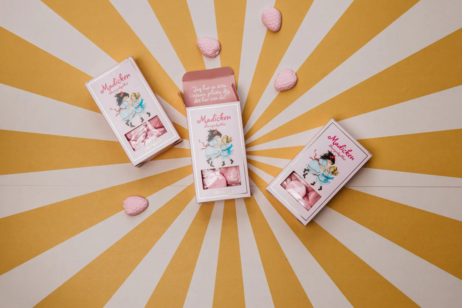Fluffiga, söta skumjordgubbar som känns precis som en sommardag i Junibacken. Madicken hade garanterat bjudit på dem under sina äventyr! Mjuka, bäriga och fulla av den där varma Astrid‑Lindgren‑känslan.