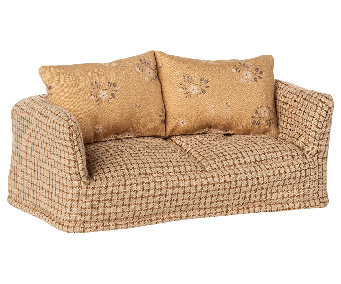 Ge dina Maileg‑möss en mysig plats att koppla av på! Den här charmiga lilla soffan är perfekt för vardagsrummet i Mouse Hole Farmhouse och rymmer hela den lilla musfamiljen. Kombinera gärna med ett litet soffbord för en komplett miniatyrmiljö.