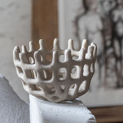 Precis som resten av ART PIECE‑kollektionen baseras den flätade skålen på Mette Ditmers egna handgjorda leroriginal. Produkterna är reproducerade i stenharts, ett kompositmaterial som är betydligt mindre ömtåligt än keramik. Det gör att konstföremålen tål vardagens användning utan att kompromissa med sin estetiska kvalitet. Varje produkt färdigställs för hand, vilket innebär att ingen skål är exakt lik den andra. Dessa små variationer bidrar till varje produkts unika uttryck.