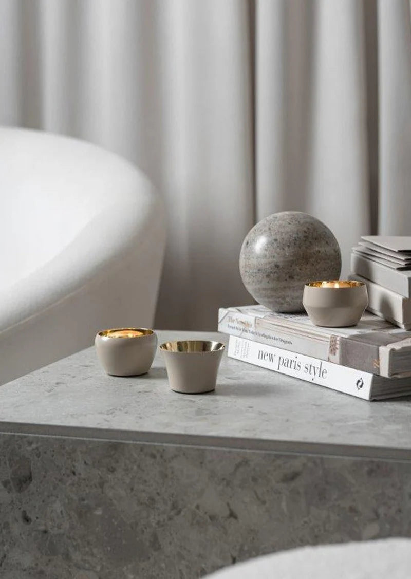 Denna modell har en utsida av beige pulverlack, insidan är i blankpolerad mässing