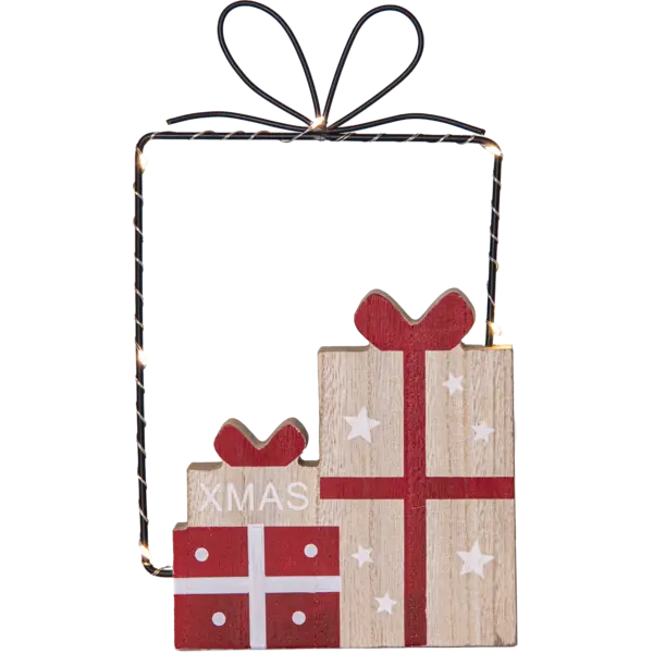 Fin juldekoration. Siluett i metall formad som ett paket med tillhörande fint målade paket i trä. Det lyser fint i siluetten från de små virade ledpunkterna. Placera den på en hylla eller i ett fönster, drivs av batteri.