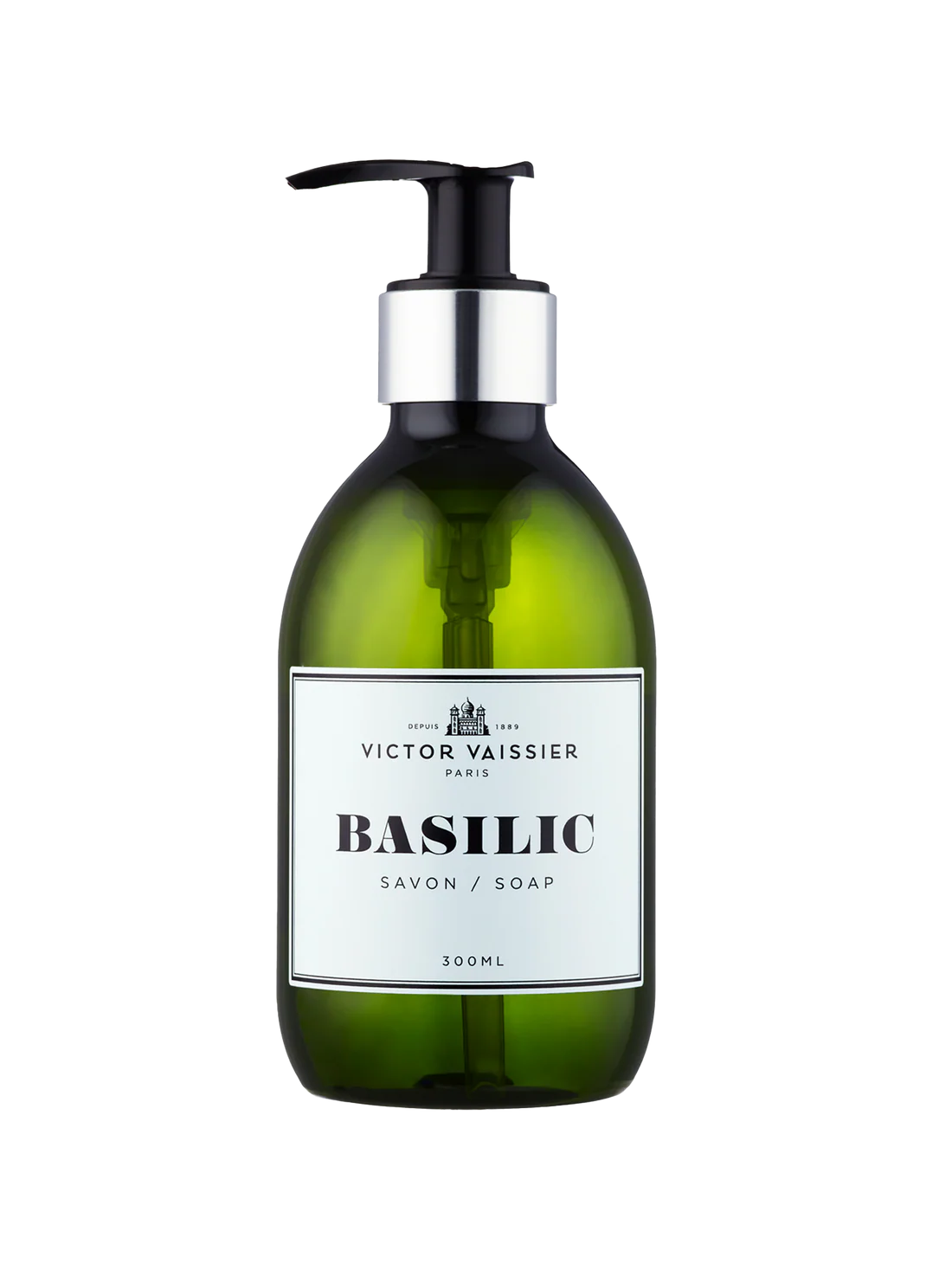 Victor Vaissier Flytande tvål Basilic är en aromatisk handtvål som förmedlar den djupa och generösa fräschören av basilika, upplyft med en lätt ton av mynta. Doften är både uppfriskande och balanserad, vilket gör varje användning till en behaglig upplevelse. Tvålen är inspirerad av Victor Vaissiers klassiska parfymer från Paris år 1889 och kombinerar tradition med modern elegans. Den levereras i en stilren pumpflaska om 300 ml och är skonsam mot huden samtidigt som den lämnar händerna rena, mjuka och väldoftande.